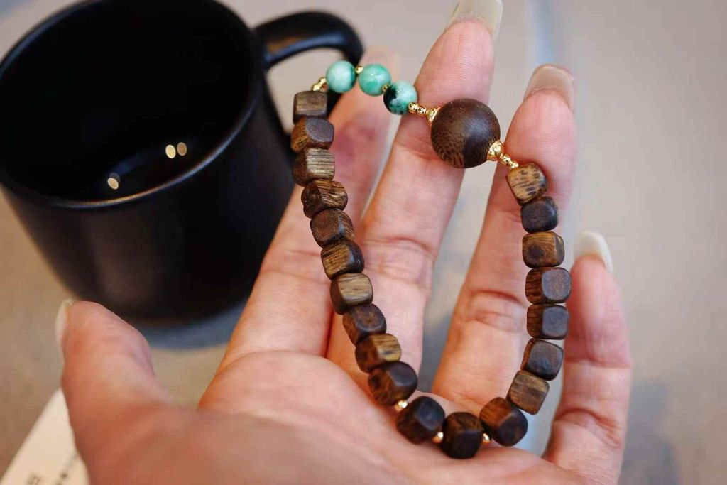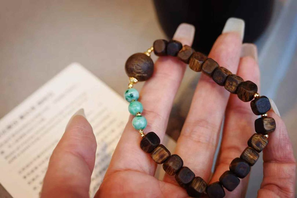 Natural Hainan Incense & Jadeite: Features authentic Hainan incense cubes (6mm+) paired with vibrant jadeite beads (12mm+), offering a soothing aroma and the timeless beauty of jadeite, symbolizing harmony and prosperity.