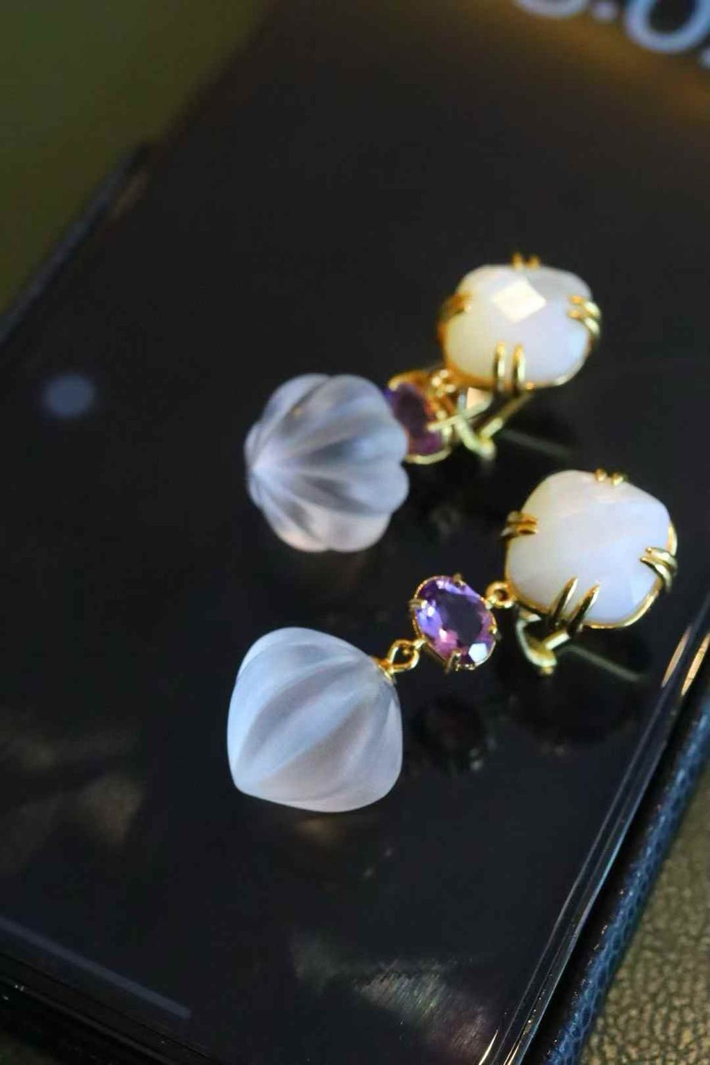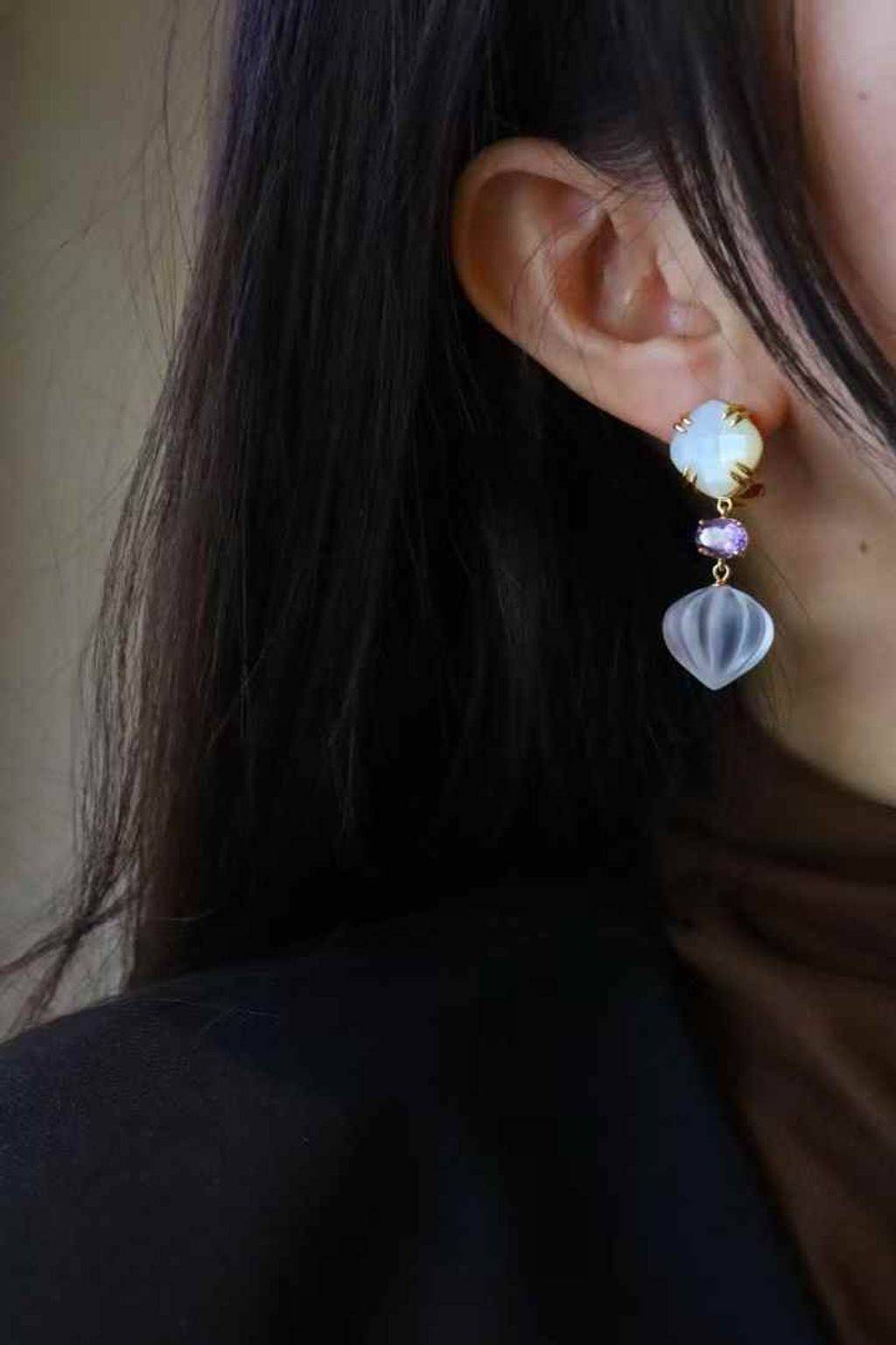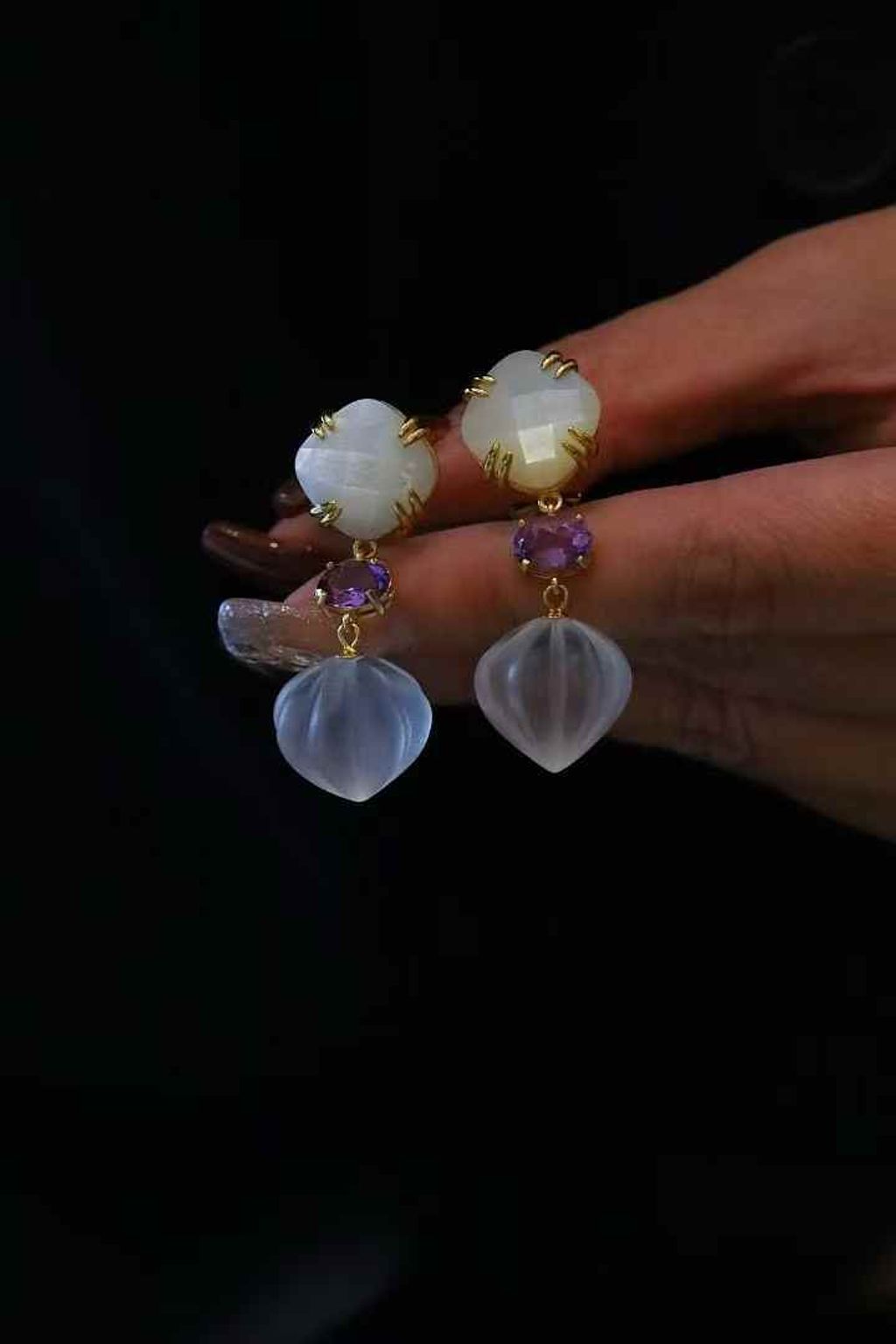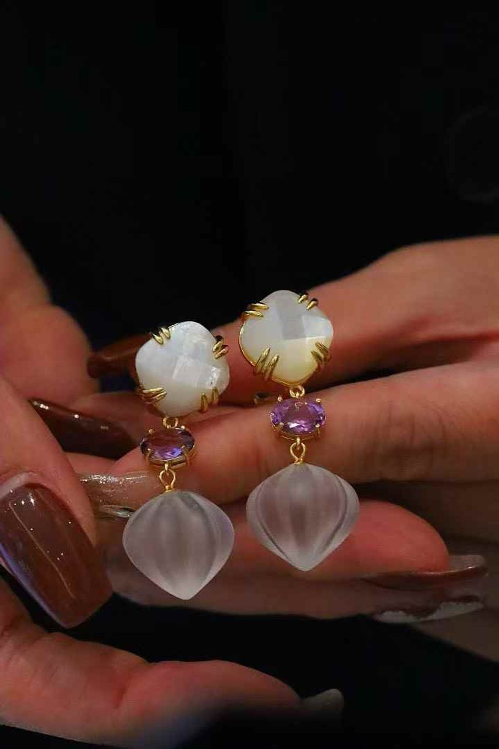 Natural white crystal, natural amethyst, white mother-of-pearl earrings